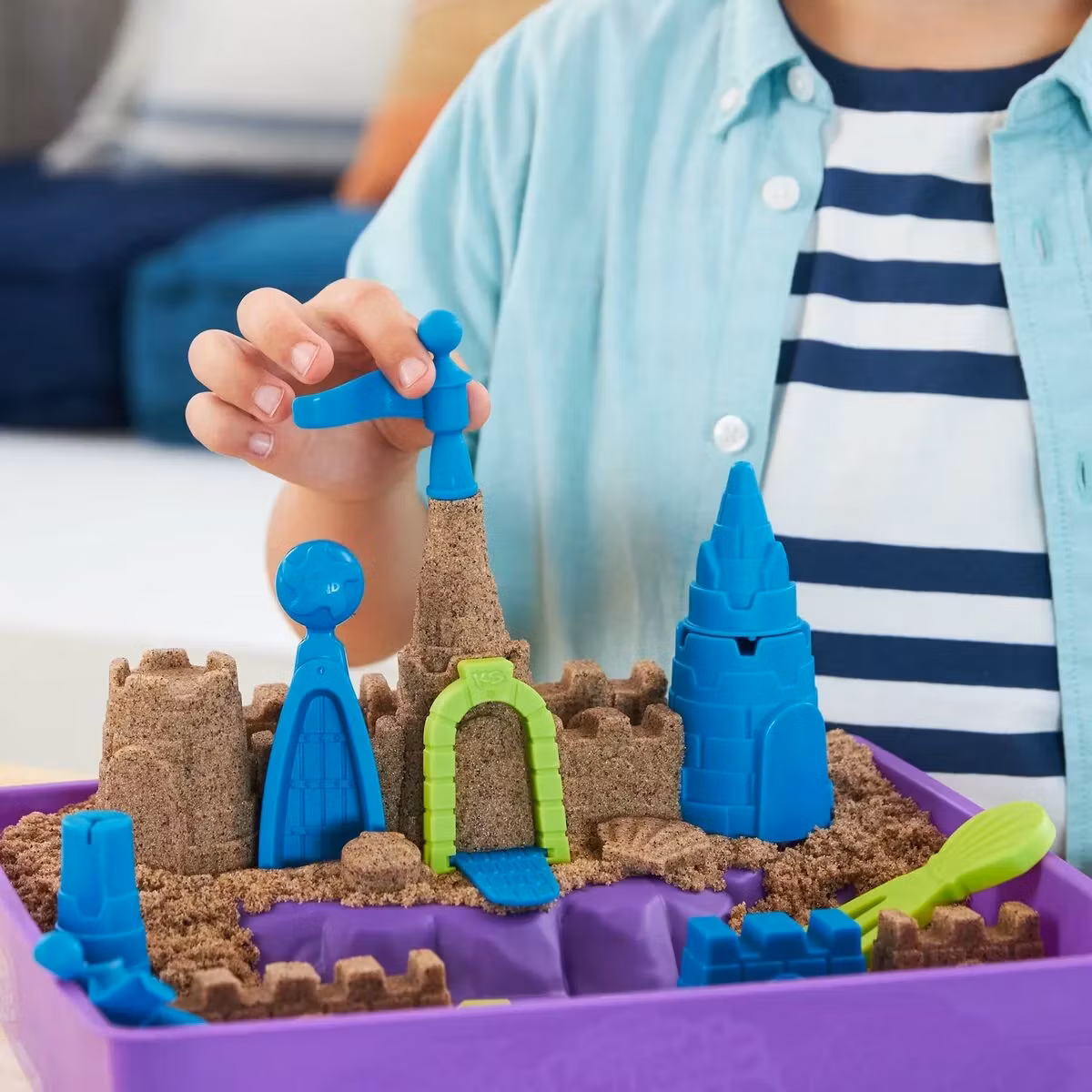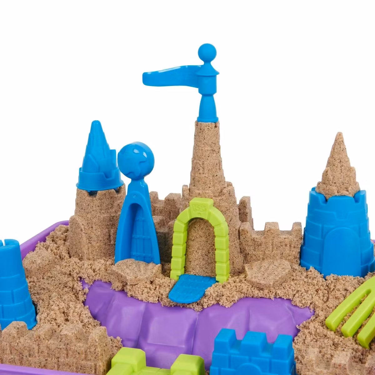 Utforska din kreativitet med de 9 slottformarna och den tvåvåningsbrickan från Kinetic Sand. Bygg sandslott, torn, murar, broar och mycket mer