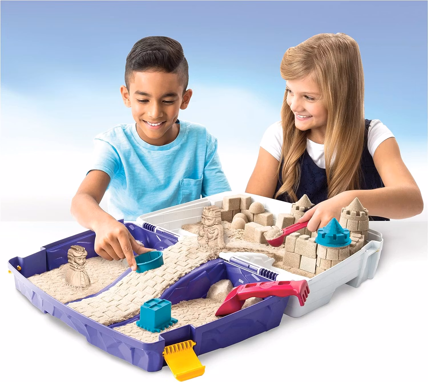 Setet innehåller två spadar och fem olika formar, vilket ger ditt barn möjlighet att skapa kungar, drottningar och slottsliknande strukturer. Med 900 gram Kinetic Sand, en magisk sand som aldrig torkar ut och är lätt att forma, kan barnen bygga och leka i timmar. Den är också säker för barn att leka med, då den är fri från gluten, vete och kasein. Perfekt för kreativa byggprojekt och fantasifulla äventyr!