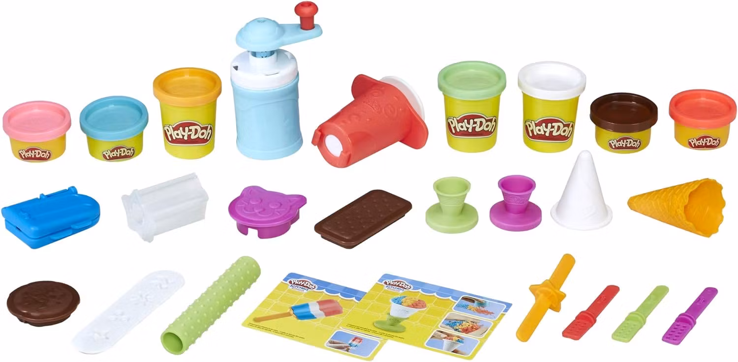 Besök Play-Doh glass affär för oändliga timmar av kreativ glasslek! Skapa de mest fantasifulla glassarna med handtaget, i våffeljärnet eller koppen. Använd den speciella vevpressen för att lägga till färgglada Play-Doh-strössel på dina skapelser. Med 7 burkar Play-Doh och många roliga tillbehör kan små konditorer skapa och servera sina egna unika glasskreationer.