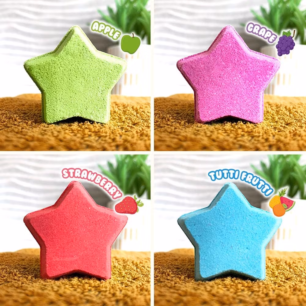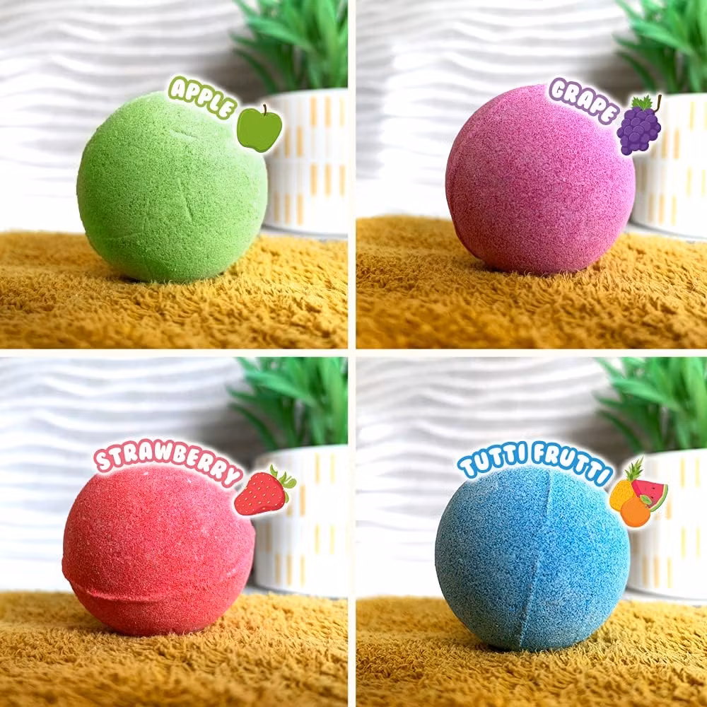 Föreställ dig att sjunka ner i ett bad med fruktiga dofter som äpple, vindruvor, jordgubbe och tuttifrutti. Det är en sann njutning för sinnena som hjälper dig att slappna av och återhämta dig efter en lång dag. Varje badbomb är noggrant formulerad för att vara mild mot huden, återfukta utan att lämna en oljig känsla.