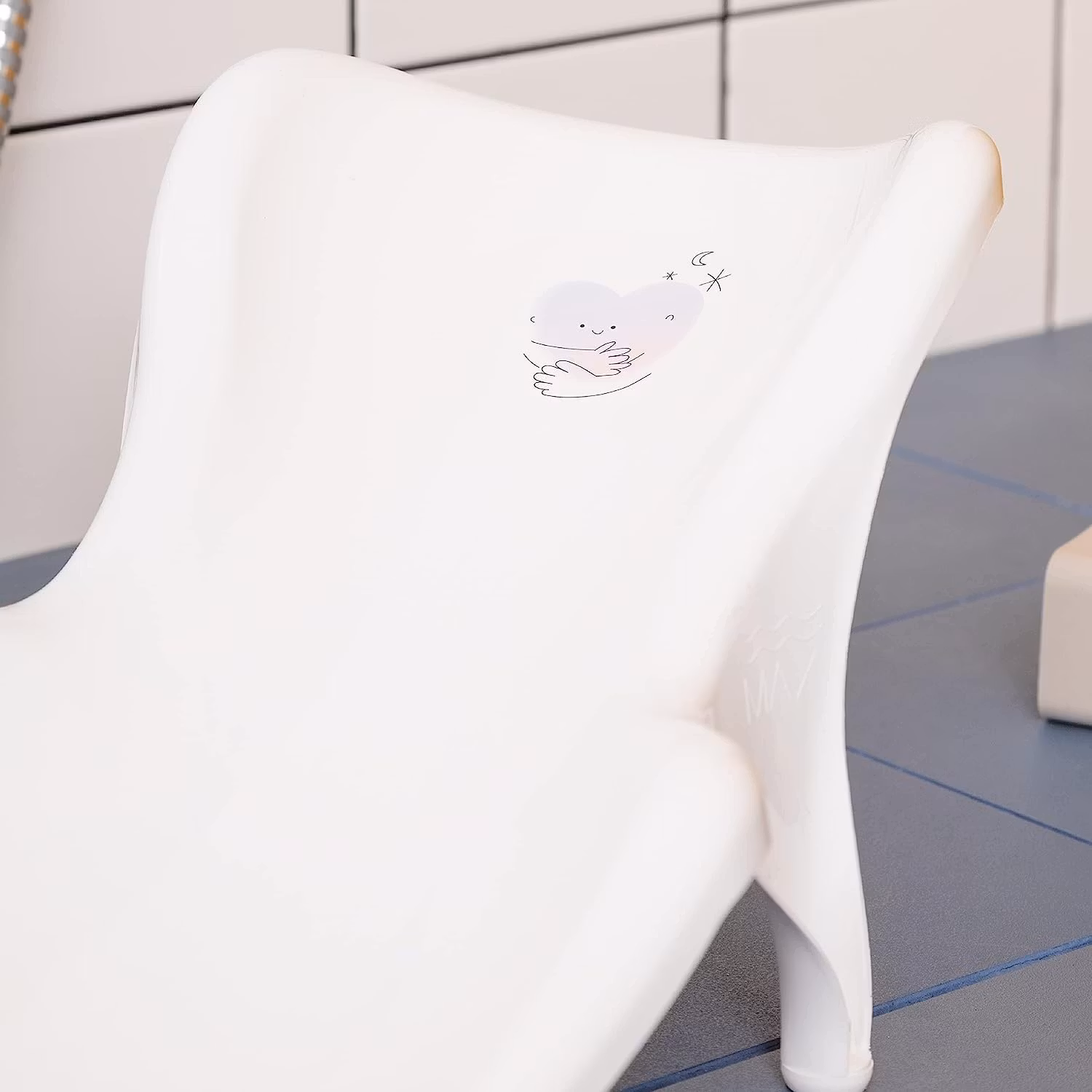 Badinsatsen har specialdesignade halkfria sugkoppar för att säkerställa att badhjälpen håller sig fast på badgolvet. Det finns också en markering på ytan för att hjälpa till med att fylla vattnet till rätt nivå.